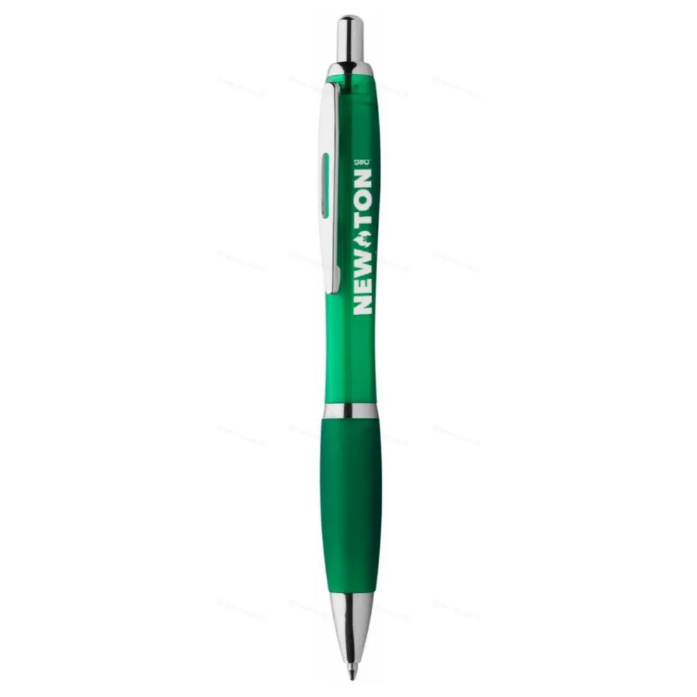 Пластиковая шариковая ручка с резиновой ручкой подходящего цвета и блестящими хромированными деталями. С синим стержнем.