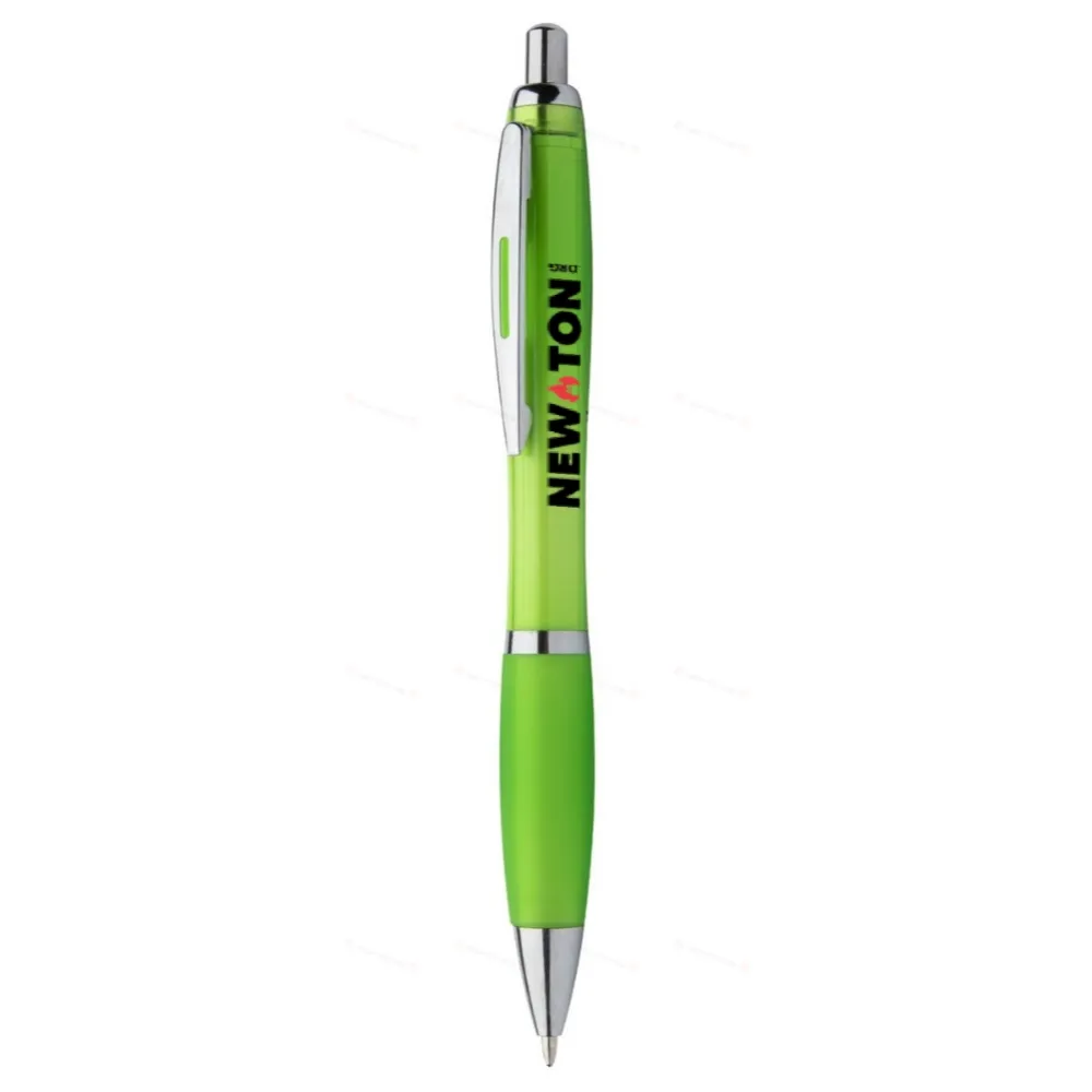 Пластиковая шариковая ручка с резиновой ручкой подходящего цвета и блестящими хромированными деталями. С синим стержнем.
