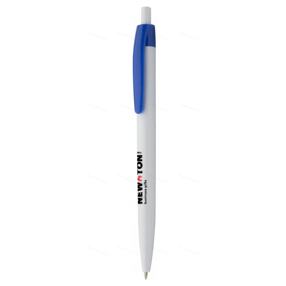 Пластиковая шариковая ручка с белым корпусом и цветным зажимом. С синим стержнем.