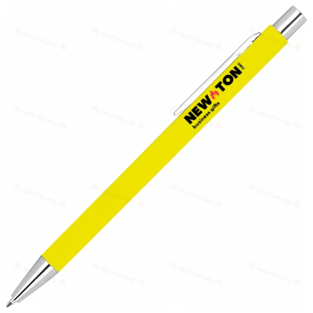 Тонкая пластиковая ручка с серебряными деталями и синими чернилами.
