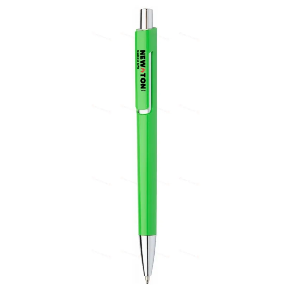 Пластиковая шариковая ручка с цветным корпусом и хромированными деталями. С синим стержнем.