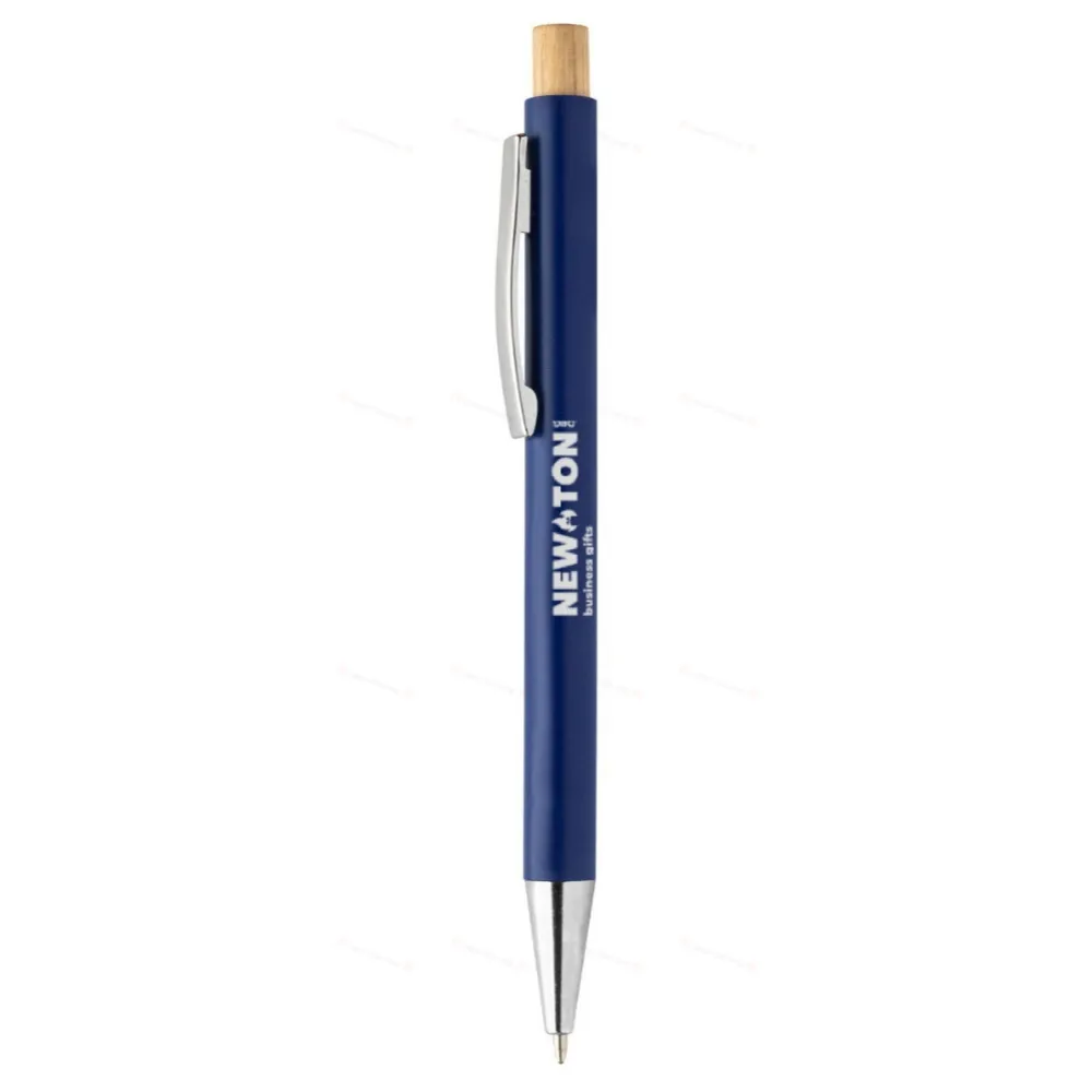 Шариковая ручка из переработанного пластика ABS с кнопкой из бамбука и металлическим зажимом. С синим стержнем.