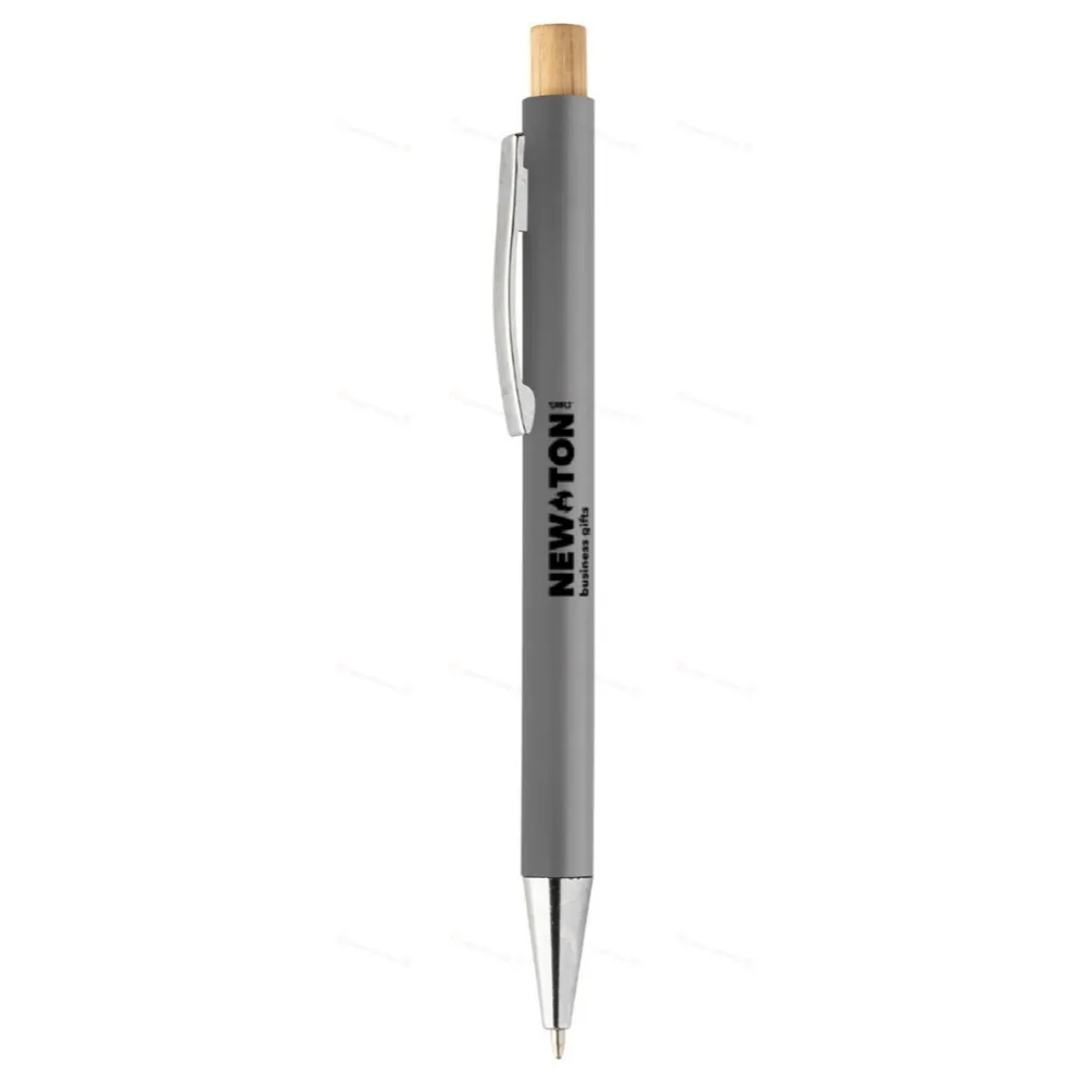 Шариковая ручка из переработанного пластика ABS с кнопкой из бамбука и металлическим зажимом. С синим стержнем.