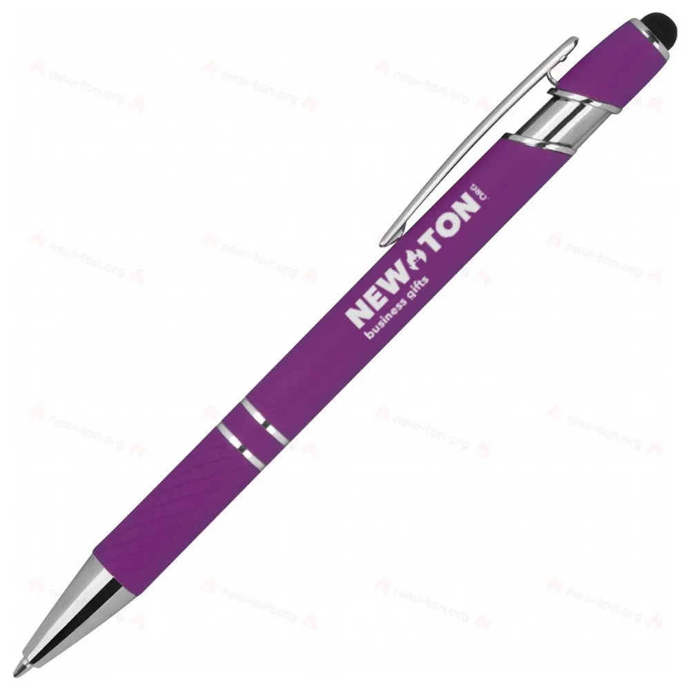 Пластиковая ручка с серебристыми элементами, синие чернила, наконечник стилуса для работы с сенсорным экраном и прорезиненная зона захвата.