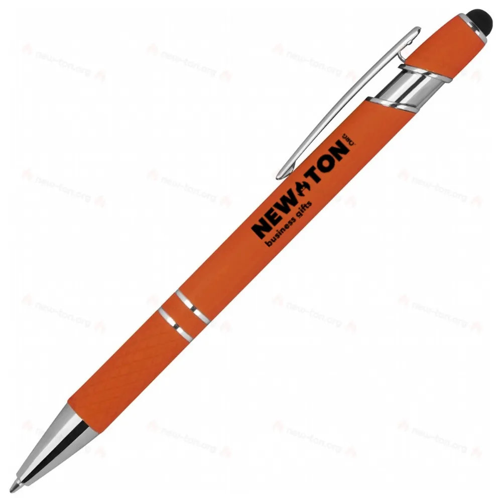 Пластиковая ручка с серебристыми элементами, синие чернила, наконечник стилуса для работы с сенсорным экраном и прорезиненная зона захвата.