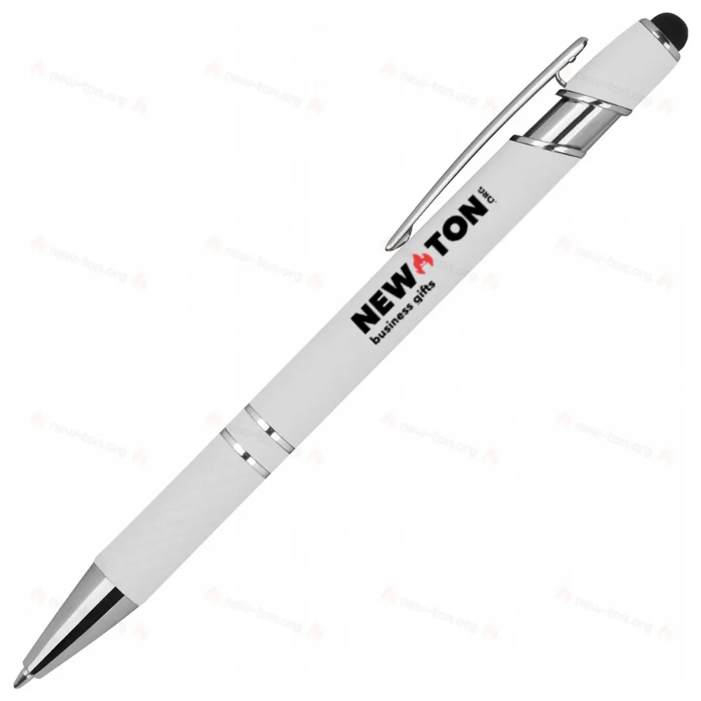 Пластиковая ручка с серебристыми элементами, синие чернила, наконечник стилуса для работы с сенсорным экраном и прорезиненная зона захвата.