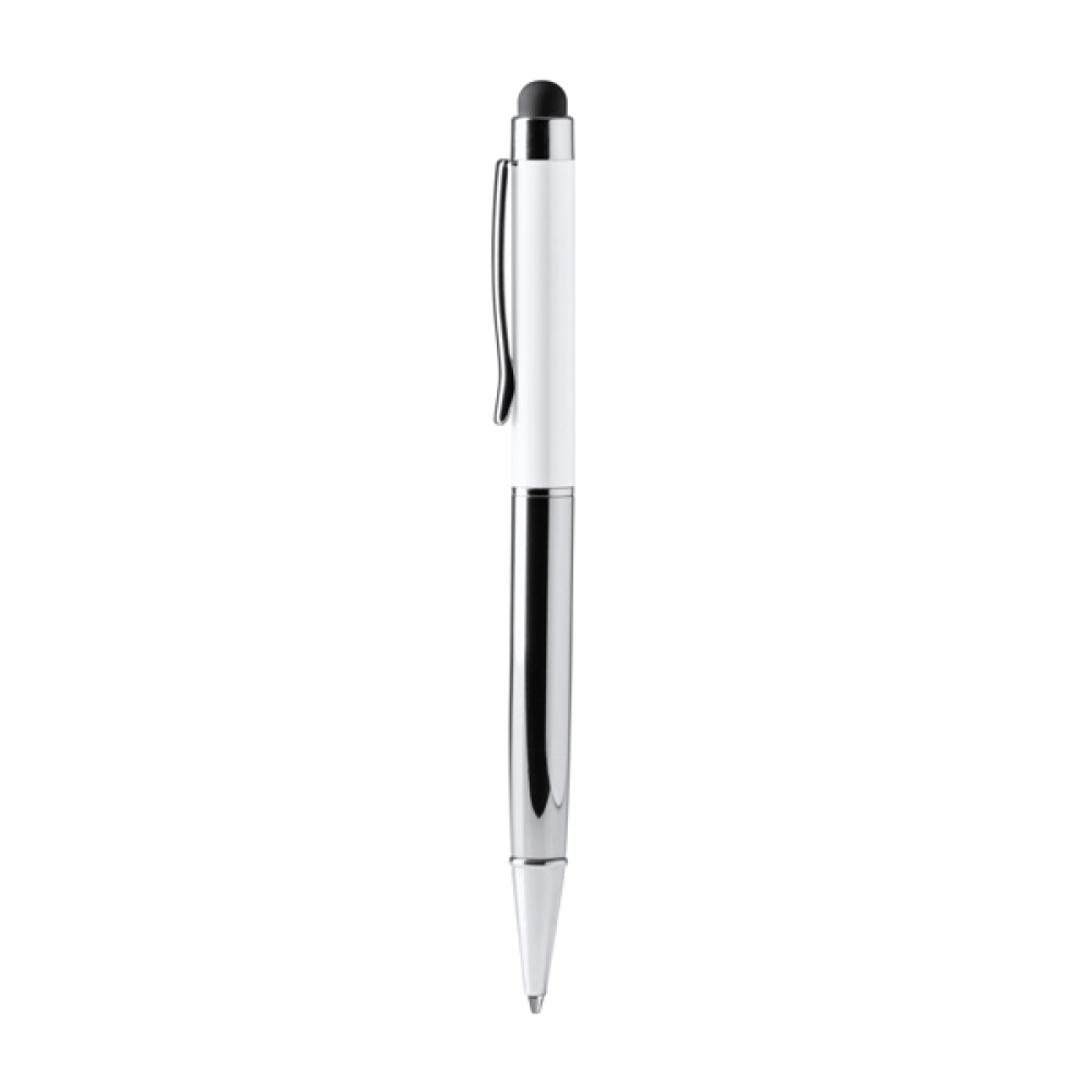 Шариковая ручка с корпусом из переработанного алюминия и сенсорным указателем. Наконечник и клип из хромированного металла. Сменный стержень для чернил в металлическом синем цвете. Представлена в коробке дизайна "крафт".