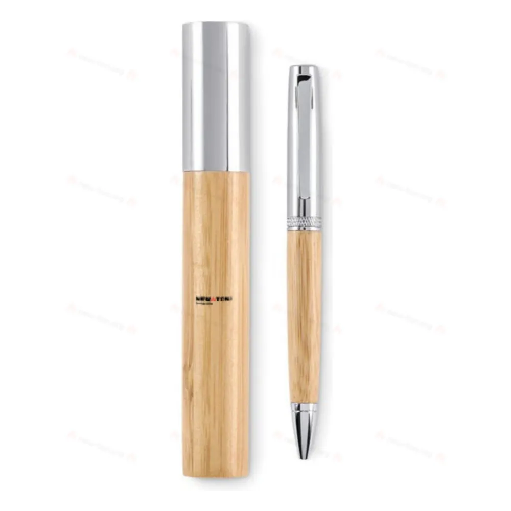 Металлическая шариковая ручка в бамбуковом корпусе в тубусе из бамбука с алюминиевой крышкой. Синие чернила.