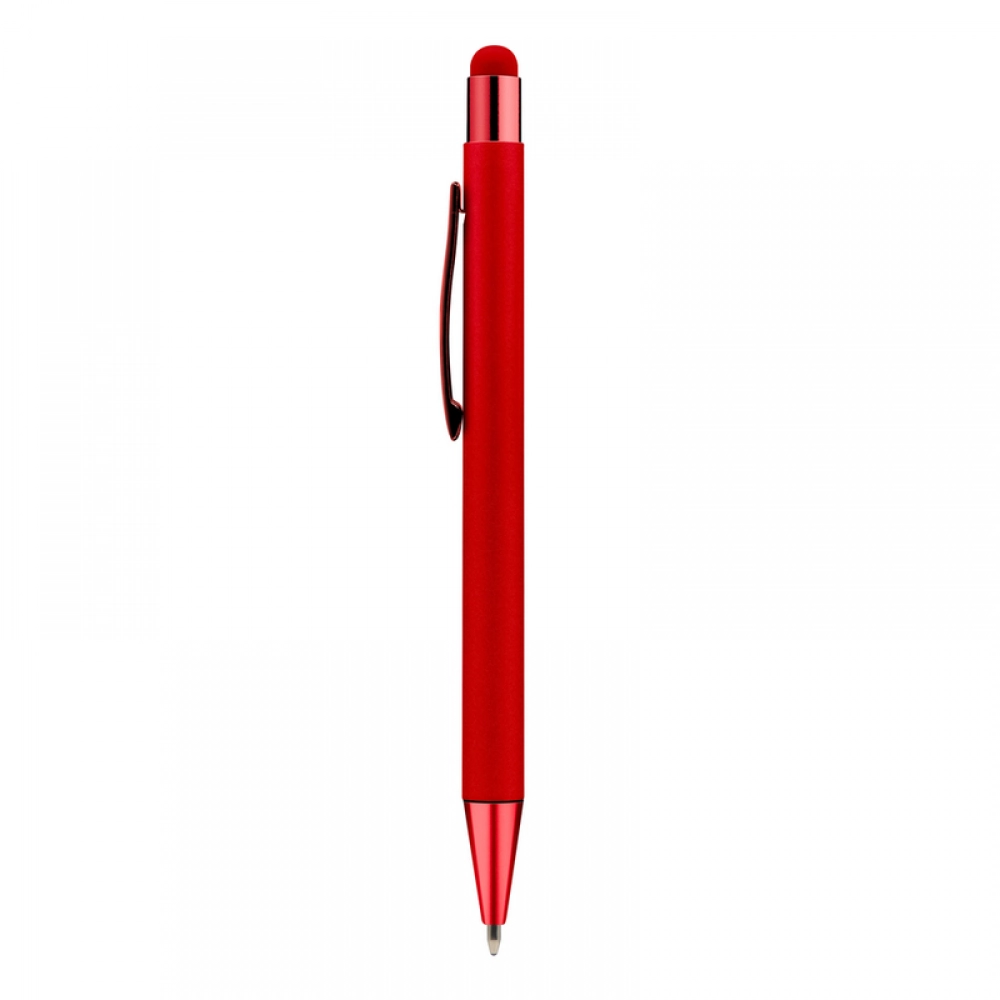 Шариковая ручка, сенсорный стилус с цветным корпусом и блестящими деталями отделки.