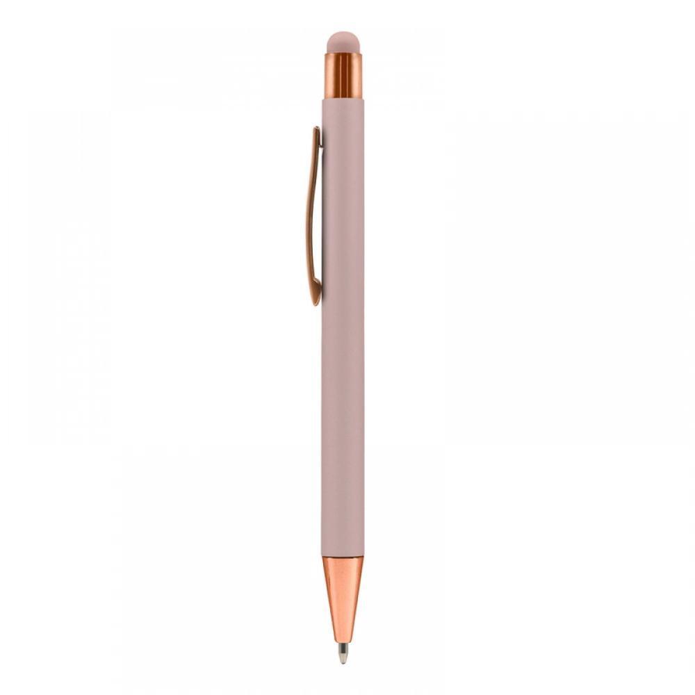 Шариковая ручка, сенсорный стилус с цветным корпусом и блестящими деталями отделки.