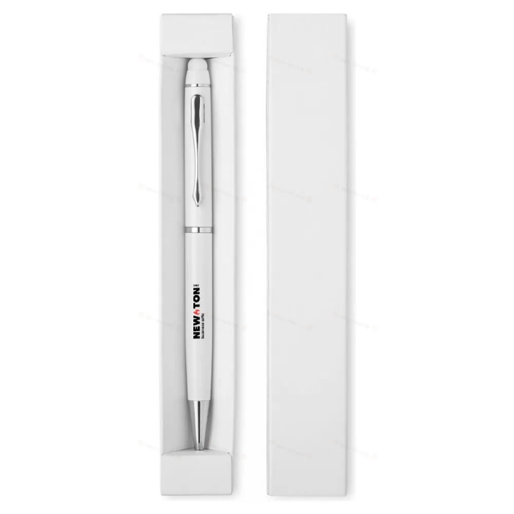 Алюминиевая шариковая ручка с поворотным механизмом и стилусом. Синие чернила. Картонная коробка.