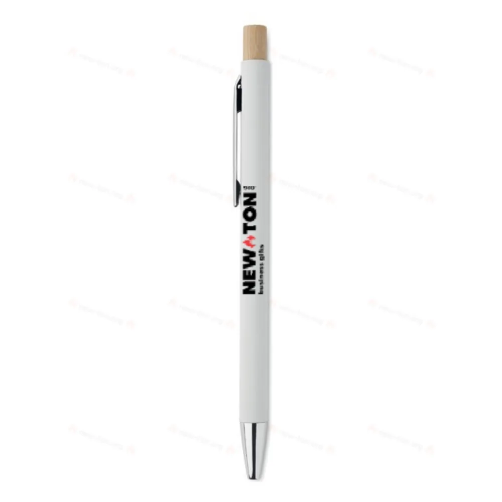 Шариковая ручка из переработанного алюминия с бамбуковой кнопкой. Серебристый наконечник и клип. Синие чернила.