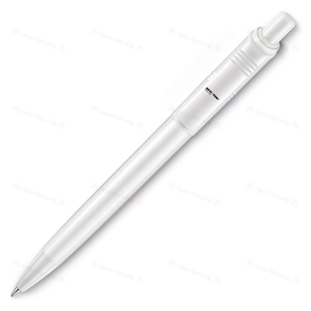 Шариковая ручка белого цвета, твердого цвета, с цветными деталями.