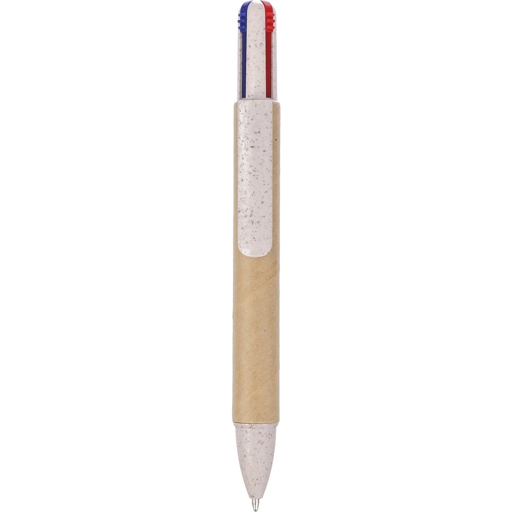 Четырехцветная ручка пишет четырьмя цветами: синим, черным, красным и зеленым, длина письма 300 метров для каждого цвета, клип для удобного крепления на кармане или обложке блокнота, изделие из переработанного картона и пшеничной соломы.