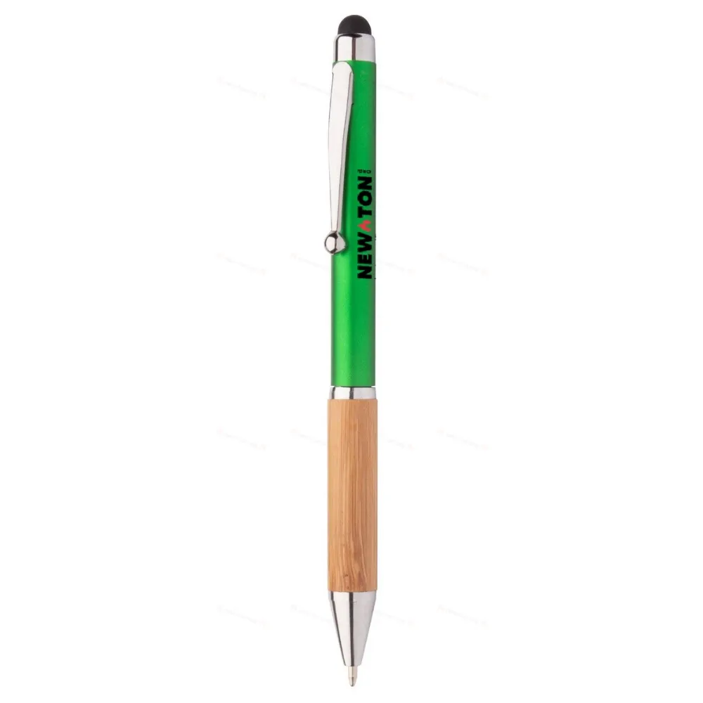 Пластиковая поворотная шариковая ручка и ручка для сенсорного экрана с бамбуковой ручкой, металлическим корпусом и блестящими хромированными деталями. С синим наполнителем.