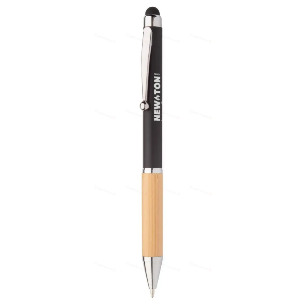 Пластиковая поворотная шариковая ручка и ручка для сенсорного экрана с бамбуковой ручкой, металлическим корпусом и блестящими хромированными деталями. С синим наполнителем.