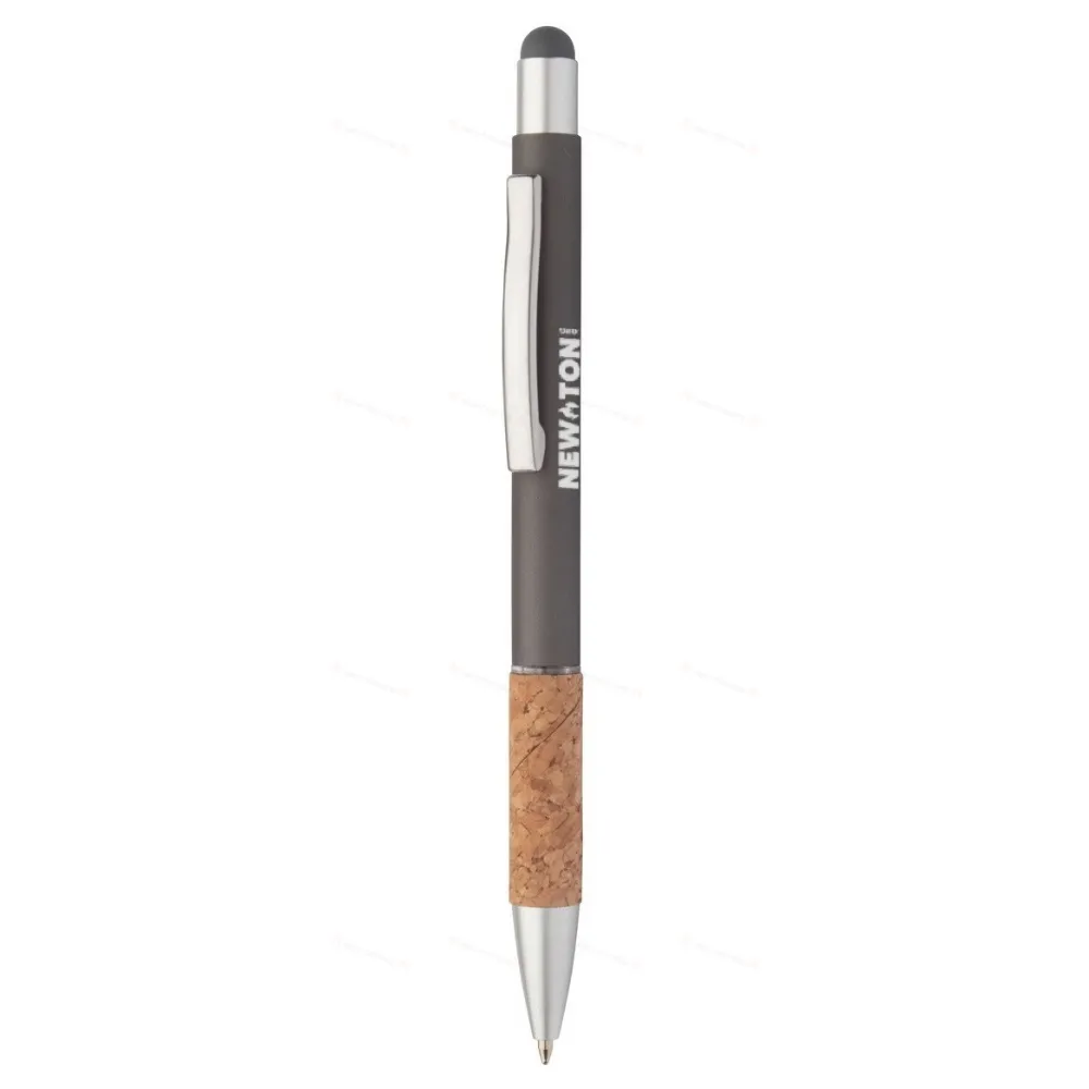 Алюминиевая шариковая ручка и ручка для сенсорного экрана с ручкой из натуральной пробки, матовым корпусом и деталями. С синим наполнителем.