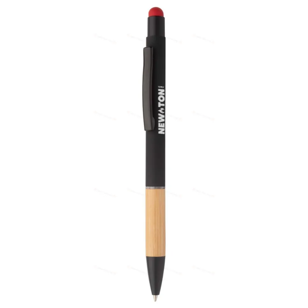 Алюминиевая шариковая ручка и ручка для сенсорного экрана с бамбуковой ручкой и прорезиненным покрытием. Со специальным покрытием для зеркальной гравировки под цвет иглы. С синим наполнителем.