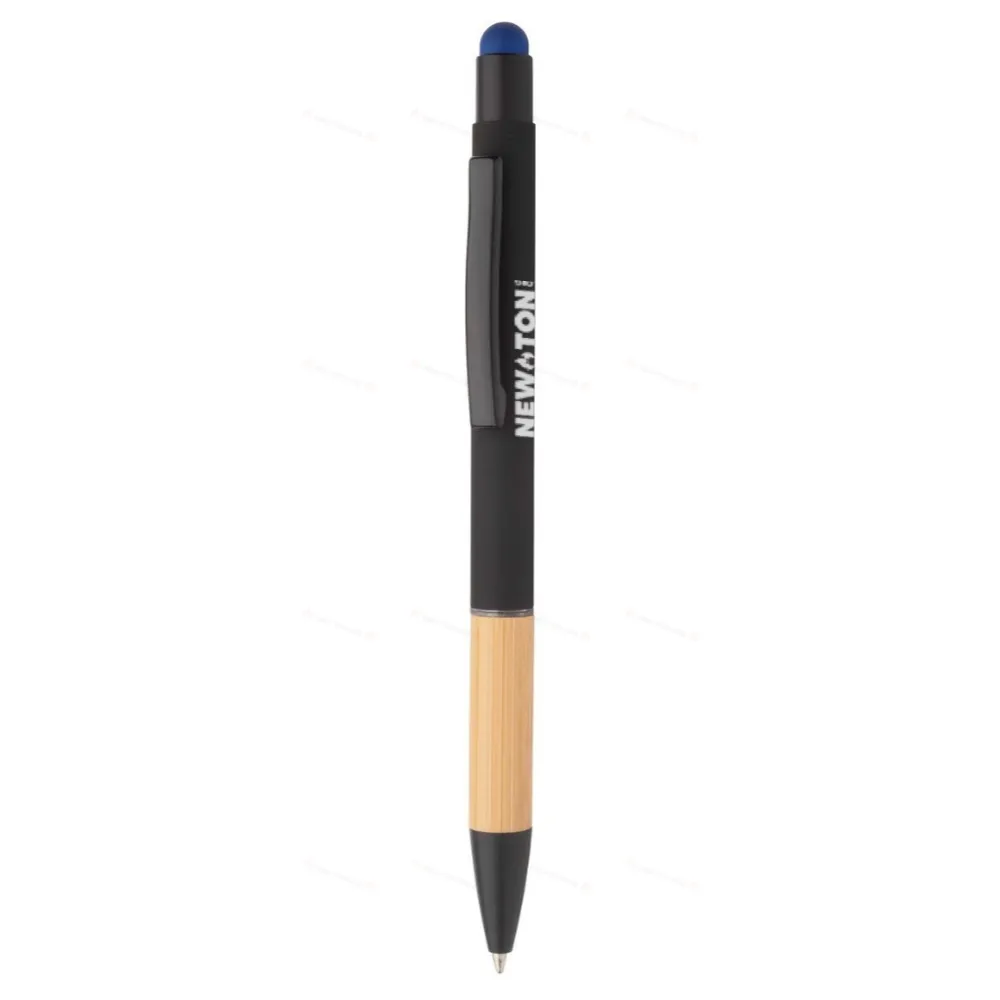 Алюминиевая шариковая ручка и ручка для сенсорного экрана с бамбуковой ручкой и прорезиненным покрытием. Со специальным покрытием для зеркальной гравировки под цвет иглы. С синим наполнителем.