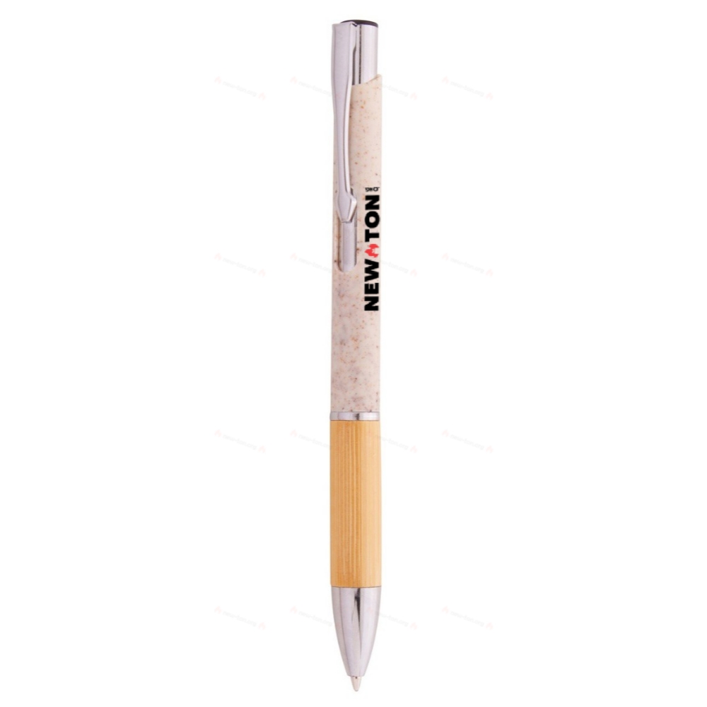 Экологичная пластиковая шариковая ручка из пшеничной соломы с бамбуковой ручкой и металлическими деталями. С голубой заправкой.