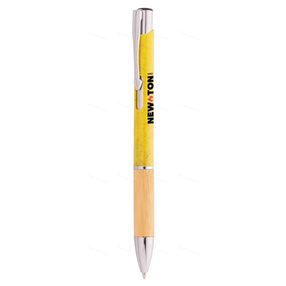 Экологичная пластиковая шариковая ручка из пшеничной соломы с бамбуковой ручкой и металлическими деталями. С голубой заправкой.