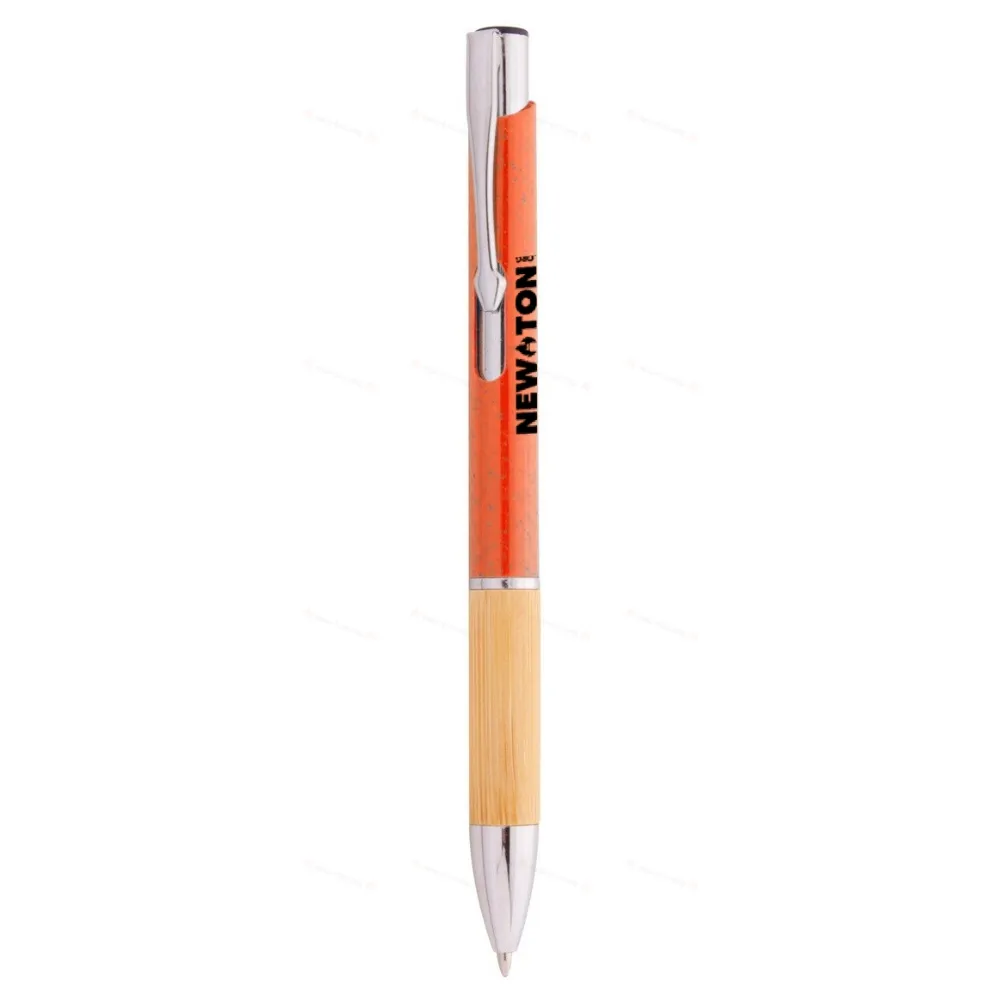 Экологичная пластиковая шариковая ручка из пшеничной соломы с бамбуковой ручкой и металлическими деталями. С голубой заправкой.