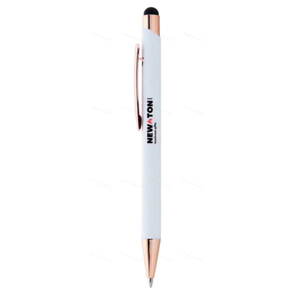 Переработанный алюминиевый шариковый и сенсорный ручка с резиновым покрытием и деталями из розового золота. С особым покрытием для зеркальной лазерной гравировки в цвете розового золота. С синим заправочным стержнем.