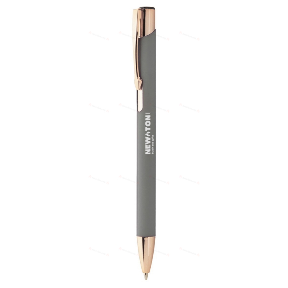 Переработанная алюминиевая шариковая ручка с резиновым покрытием и деталями из розового золота. Специальное покрытие для зеркальной лазерной гравировки в цвете розового золота. С синим заправочным стержнем.