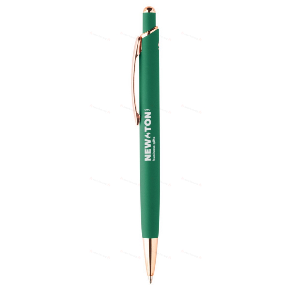 Шариковая ручка из переработанного алюминия с резиновым покрытием и деталями из розового золота. Специальное покрытие для зеркальной лазерной гравировки в цвете розового золота. С синим заправочным стержнем.