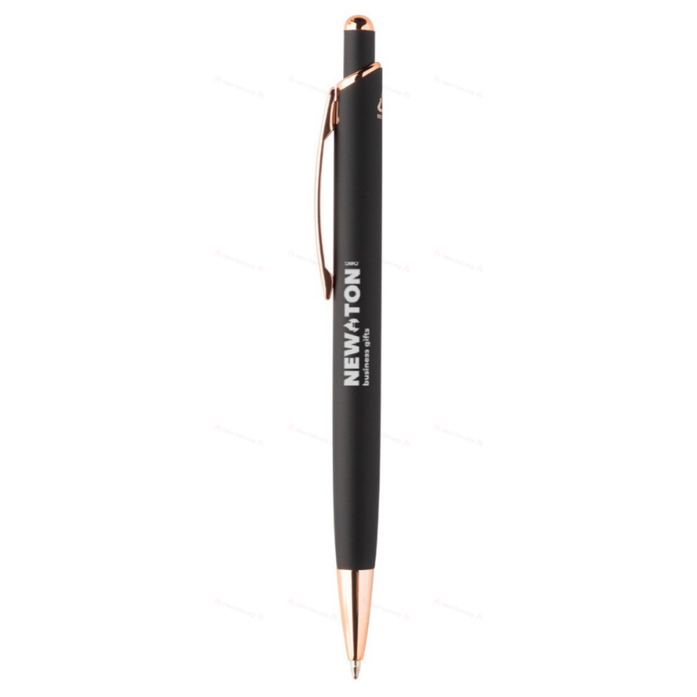 Шариковая ручка из переработанного алюминия с резиновым покрытием и деталями из розового золота. Специальное покрытие для зеркальной лазерной гравировки в цвете розового золота. С синим заправочным стержнем.