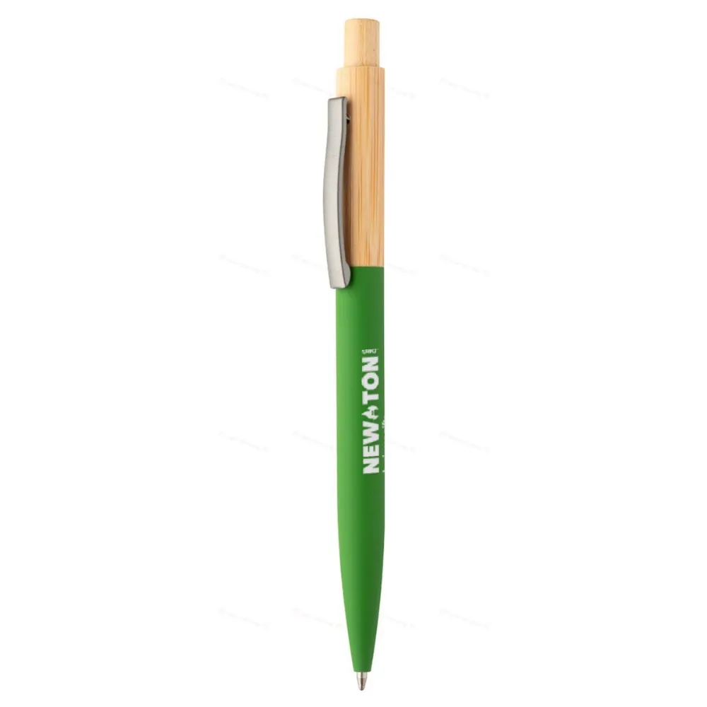Шариковая ручка из бамбука и переработленного алюминия с резиновым покрытием и зажимом из гантельного металла. С синим стержнем.