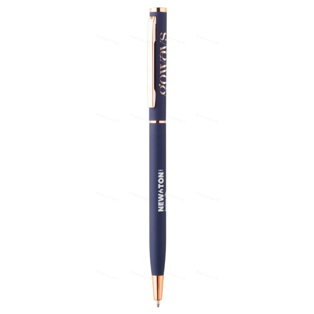 Переработанная алюминиевая шариковая ручка с резиновым покрытием и деталями из розового золота. Специальное покрытие для зеркальной лазерной гравировки в цвете розового золота. С синим заправочным стержнем.
