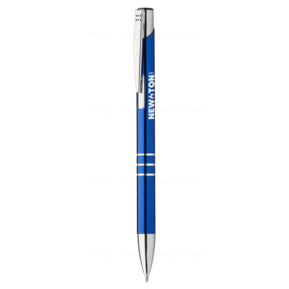 Шариковая ручка из переработанного алюминия с металлическим покрытием и синим стержнем.