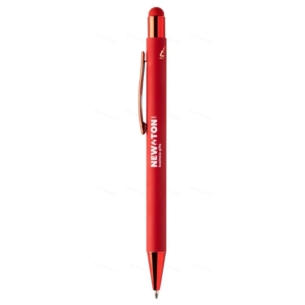 Шариковая ручка и стилус из переработанного алюминия с резиновым корпусом и цветными блестящими металлическими отделками. Специальное покрытие для зеркальной гравировки, соответствующей металлическим деталям. С синим заправочным стержнем.