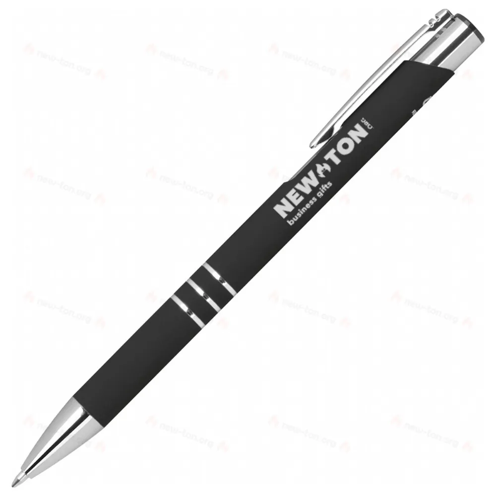 Ручка из переработанного алюминия с резиновым покрытием и синей гелевой вставкой.