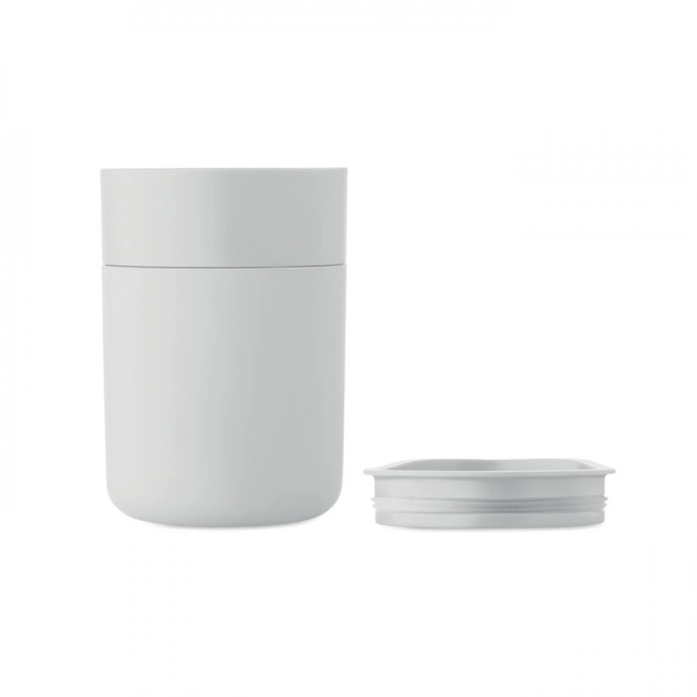 Пластиковый стакан с силиконовым чехлом и пластиковой крышкой с ползунком. Объем: 330 мл. Поскольку это одностенная кружка, тепло может передаваться.