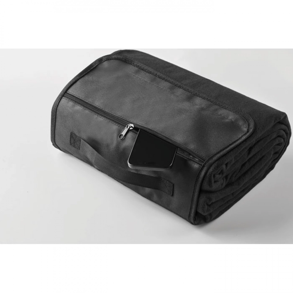 Foldable RPET 150 gr/m² (68% recycled polyester/32% regular polyester) polar fleece picnic blanket with water resistant coated PEVA reverse side. Front flap with zippered pocket and handle.