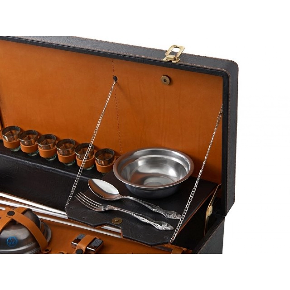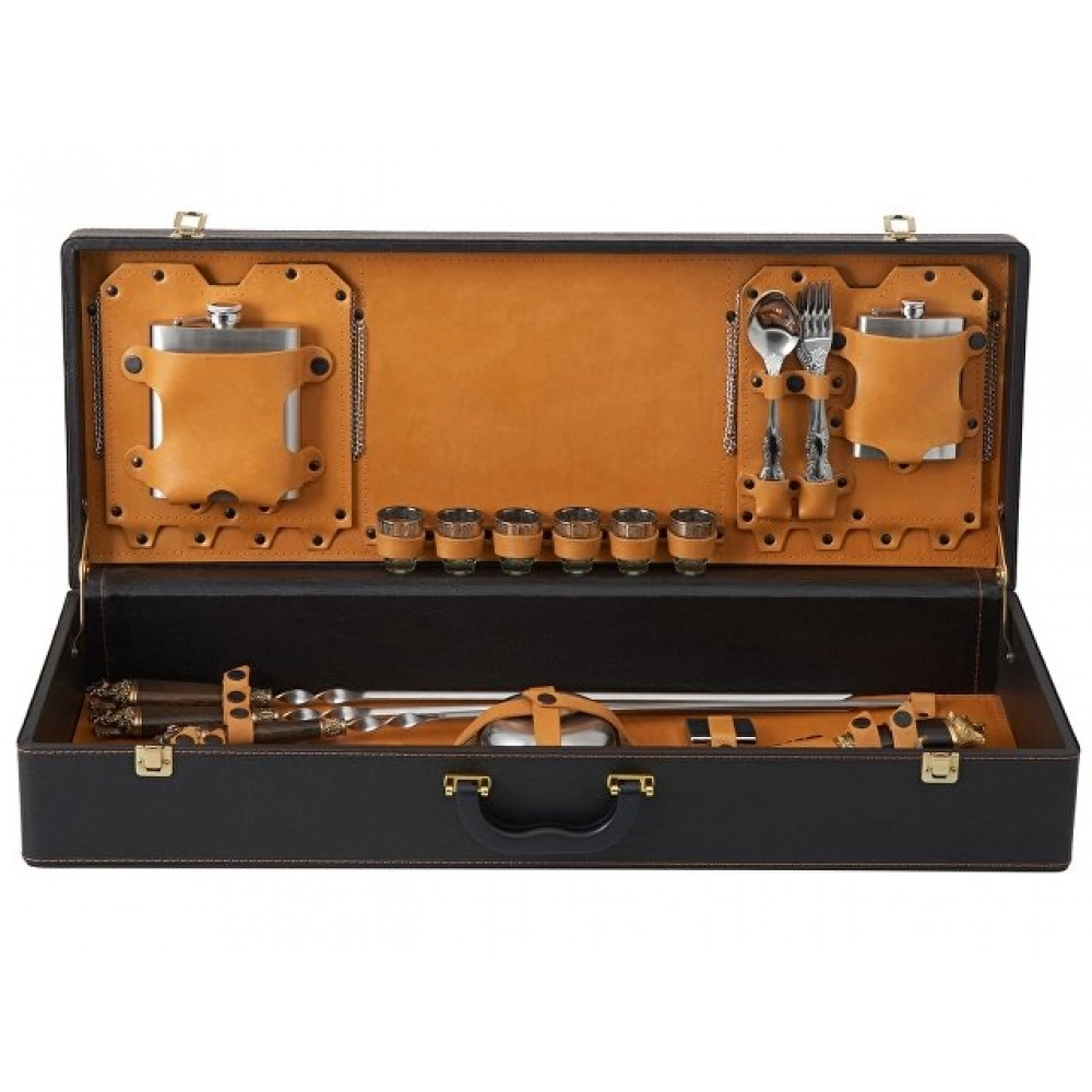 Кейс из сплит-кожи, с повышенной износостойкостью, внутренняя отделка натуральная кожа. Все аксессуары надежно крепятся к кейсу кожаными ремешками на кнопке, обеспечивая удобство транспортировки и сохранность содержимого. В комплект входит: - шампура большие- 6 шт - фляга 500 мл - фляга 250 мл - тарелка- 6 шт - вилка- 6 шт - ложка- 6 шт - стопка 25 мл- 6 шт - нож "Тяпка" - нож разделочный - зажигалка