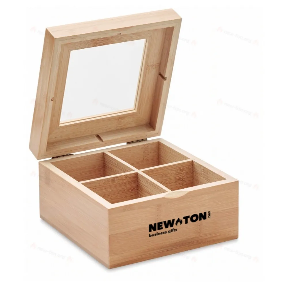 Коробка для чая из бамбука с прозрачной стеклянной крышкой. В четырех отсеках вы можете легко хранить 24 чайных пакетика. Так как бамбук является натуральным материалом, у отдельных изделий могут быть небольшие различия в цвете и размере