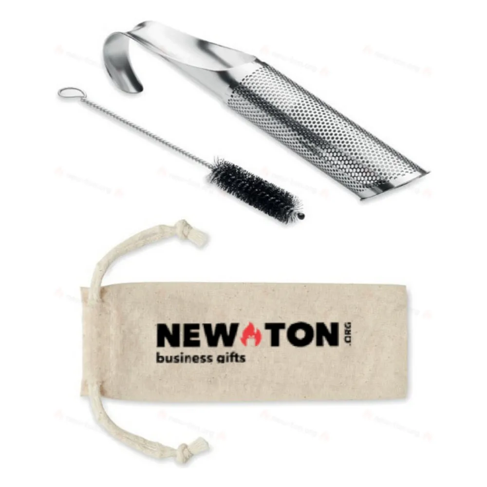 Многоразовый набор для заваривания чая из нержавеющей стали в хлопковом мешочке. В комплект входит фильтр для чая с компактным изогнутым крючком, позволяющим ему свисать над краем чашки или кружки, и щеточка для чистки.