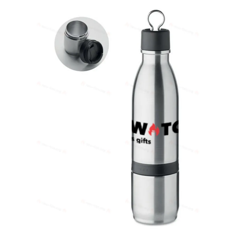 Бутылка 2-в-1 с двойными стенками из нержавеющей стали с вакуумной изоляцией и съемной откидной крышкой. Герметична. Объем: бутылка: 500 мл / стаканчик: 310 мл.