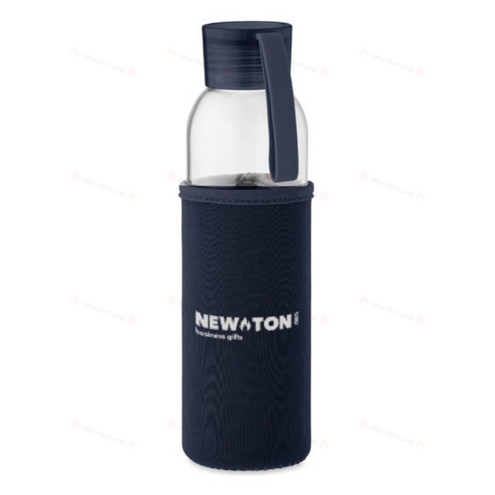 Бутылка из переработанного стекла с неопреновым чехлом и полипропиленовой крышкой с силиконовым держателем. Герметична. Емкость: 500 мл.