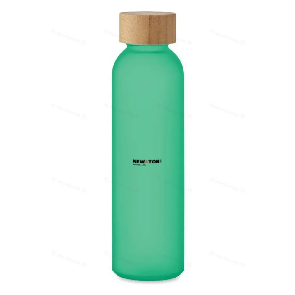 Стеклянная бутылка с матовым покрытием и бамбуковой крышкой. Герметична. Емкость: 500 мл.