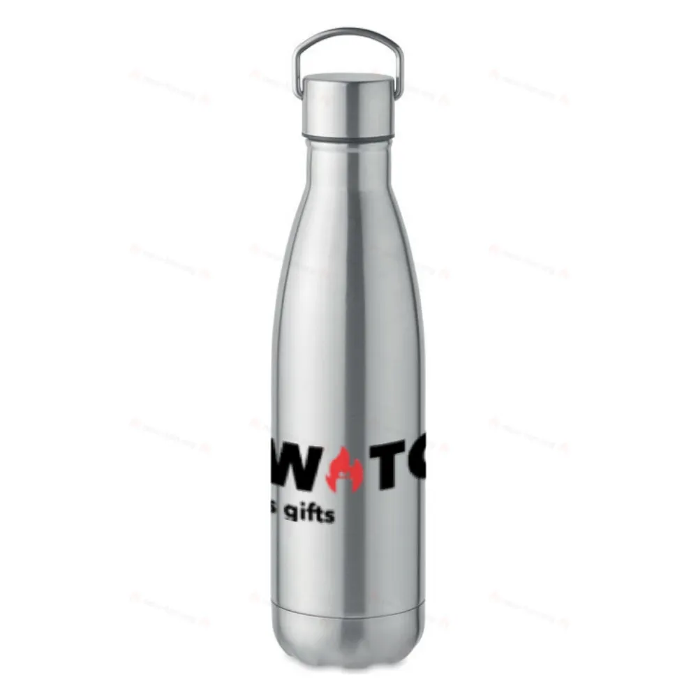 Термобутылка с двойными стенками из нержавеющей стали (90% переработанной нержавеющей стали и 10% нержавеющей стали) с крышкой и ручкой. Герметична. Емкость: 500 мл.
