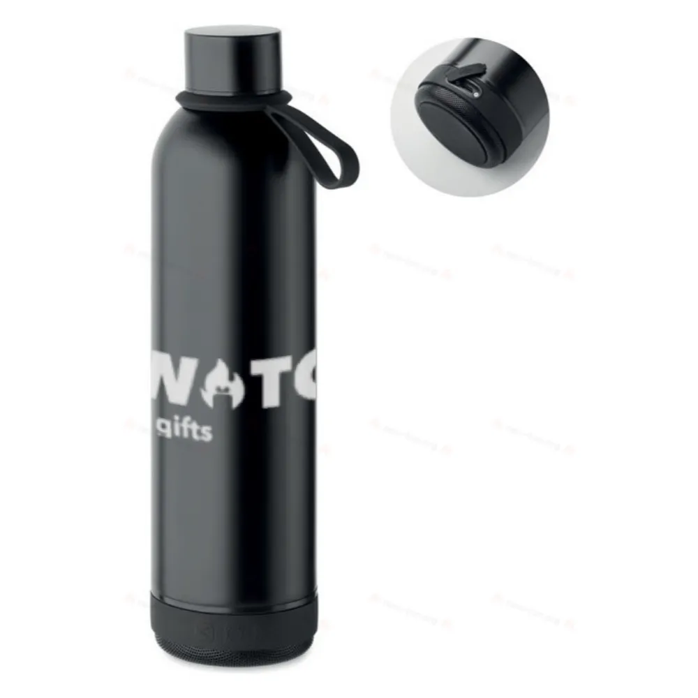 Бутылка с двойными стенками из переработанной нержавеющей стали (90%) и обычной нержавеющей стали (10%), силиконовый ремешок для переноски с отсоединяемой беспроводной колонкой 3 Вт. Объем: 500 мл. Аккумулятор 500 мАч. Отсоедините колонку, чтобы помыть бутылку. Герметична.