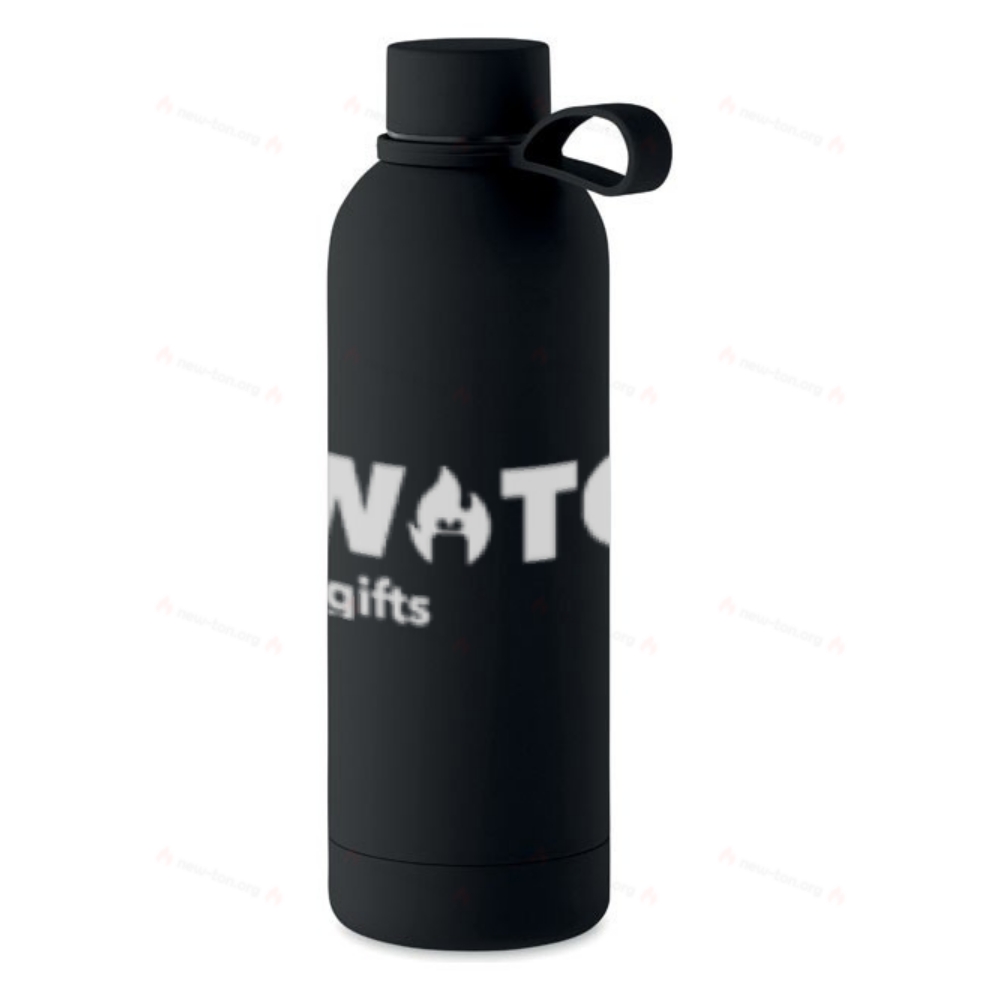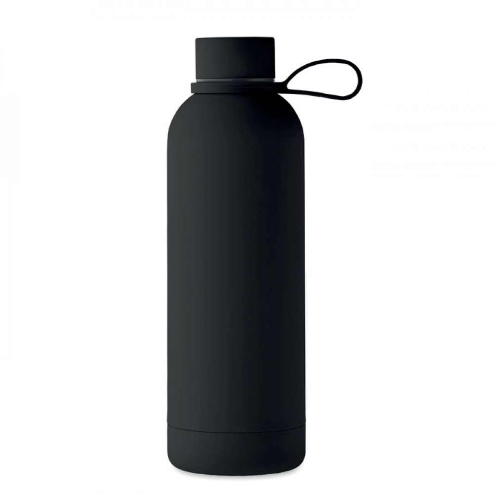 Бутылка с двойными стенками из переработанной нержавеющей стали (90%) и обычной нержавеющей стали (10%) с резиновым покрытием и силиконовым ремешком. Герметична. Объем: 500 мл.