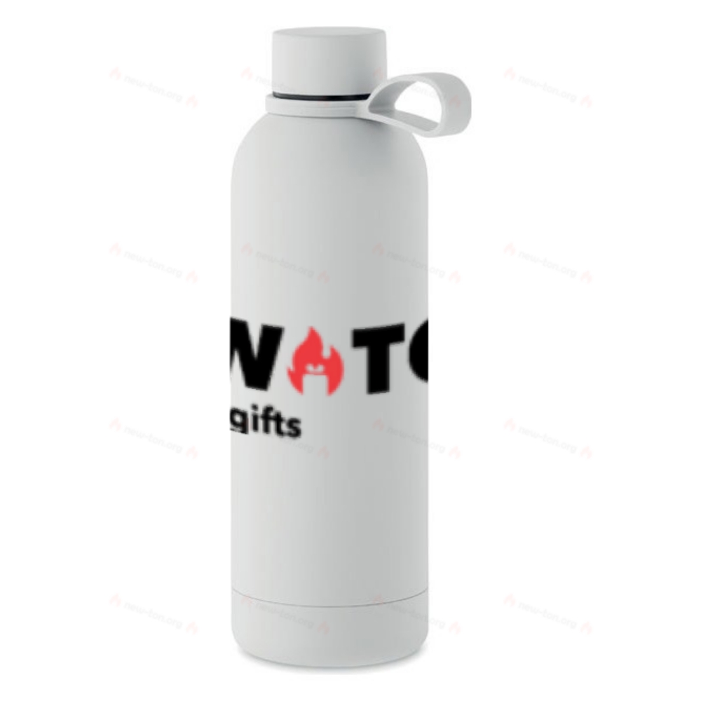 Бутылка с двойными стенками из переработанной нержавеющей стали (90%) и обычной нержавеющей стали (10%) с резиновым покрытием и силиконовым ремешком. Герметична. Объем: 500 мл.