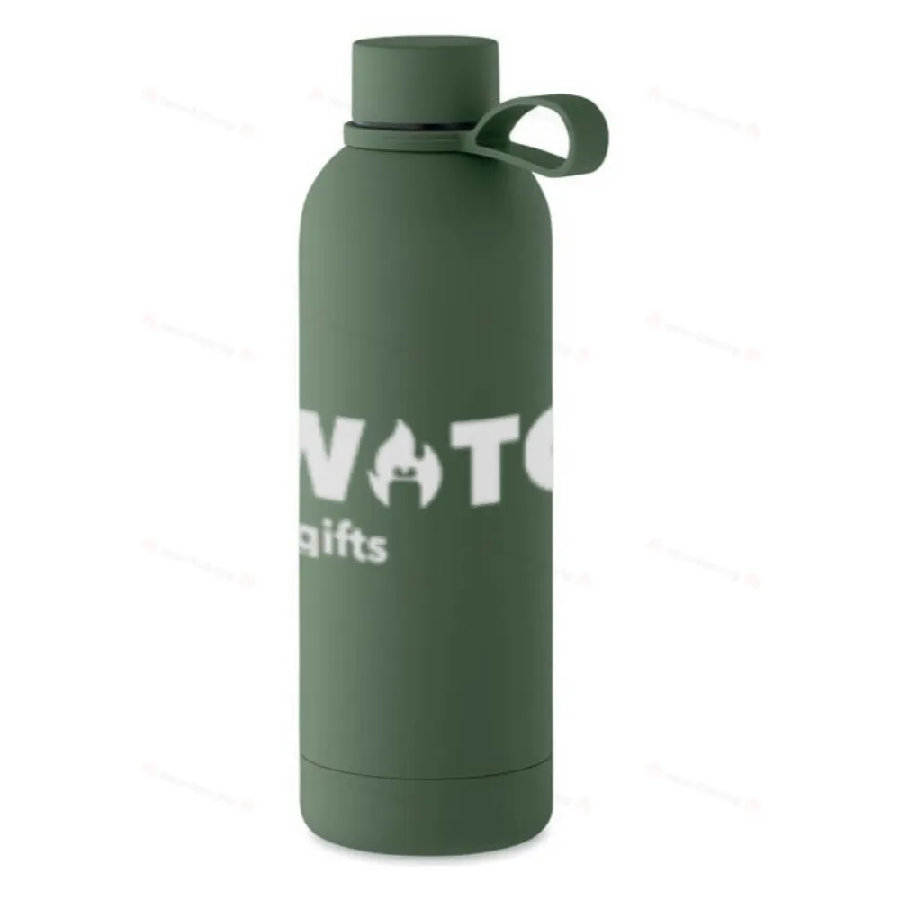 Бутылка с двойными стенками из переработанной нержавеющей стали (90%) и обычной нержавеющей стали (10%) с резиновым покрытием и силиконовым ремешком. Герметична. Объем: 500 мл.
