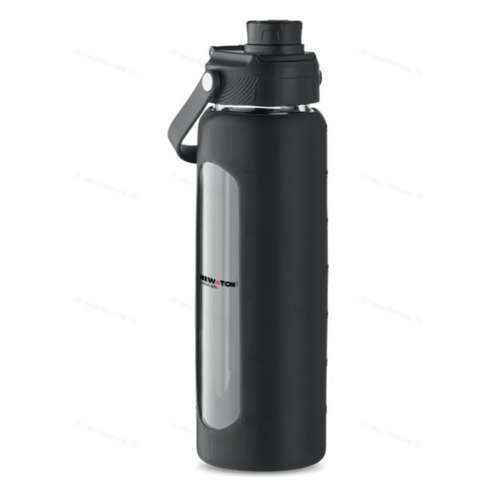 Бутылка из боросиликатного стекла с силиконовой прозрачной вставкой и полипропиленовой крышкой с ручкой для переноски. Герметична. Емкость: 750 мл.