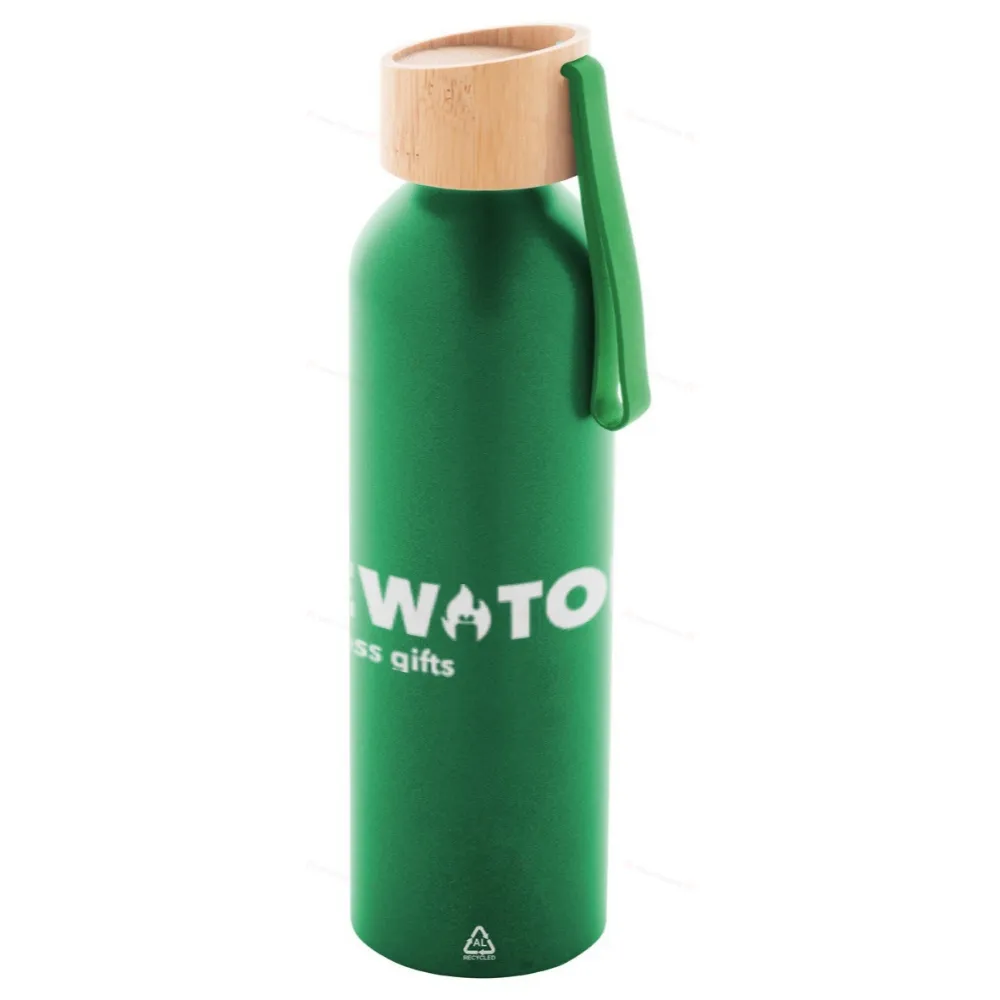 Бутылка из переработленного алюминия с крышкой из бамбука и силиконовым ремешком подходящего цвета, 600 мл.